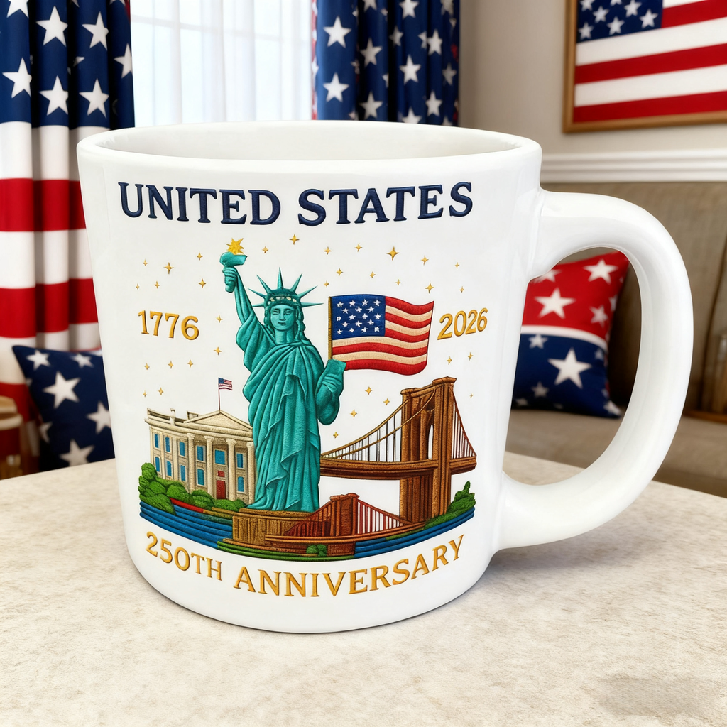 Commemorate the 250th anniversary of American independence with every cup of coffee or tea. Featuring iconic symbols like the Statue of Liberty, the American flag, the White House, and the Brooklyn Bridge, this hand-painted mug is a tribute to freedom, patriotism, and timeless American spirit. 🇺🇸