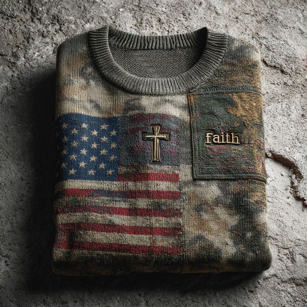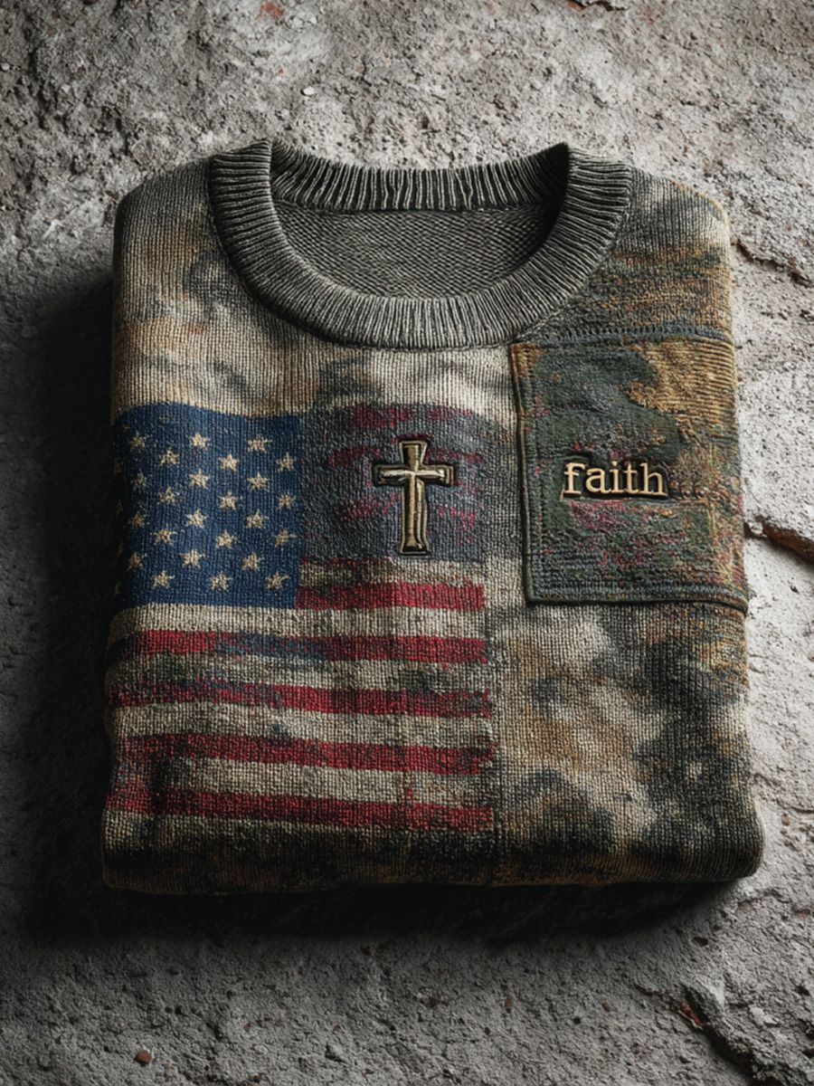 Faith Vintage American Flag Patchwork Art Print Casual Knit Sweater