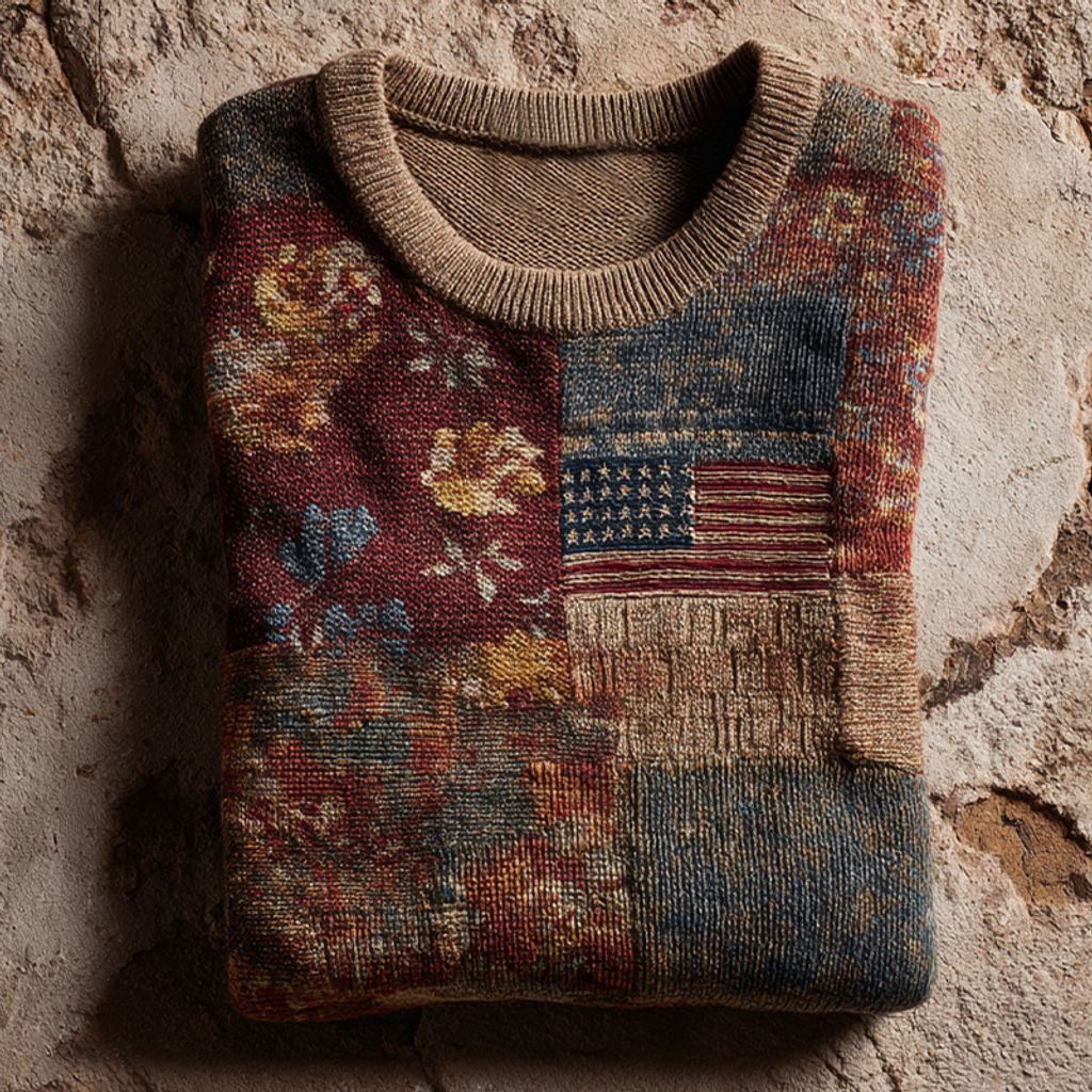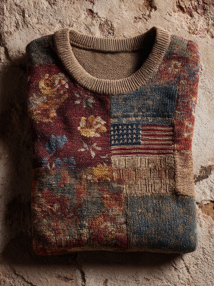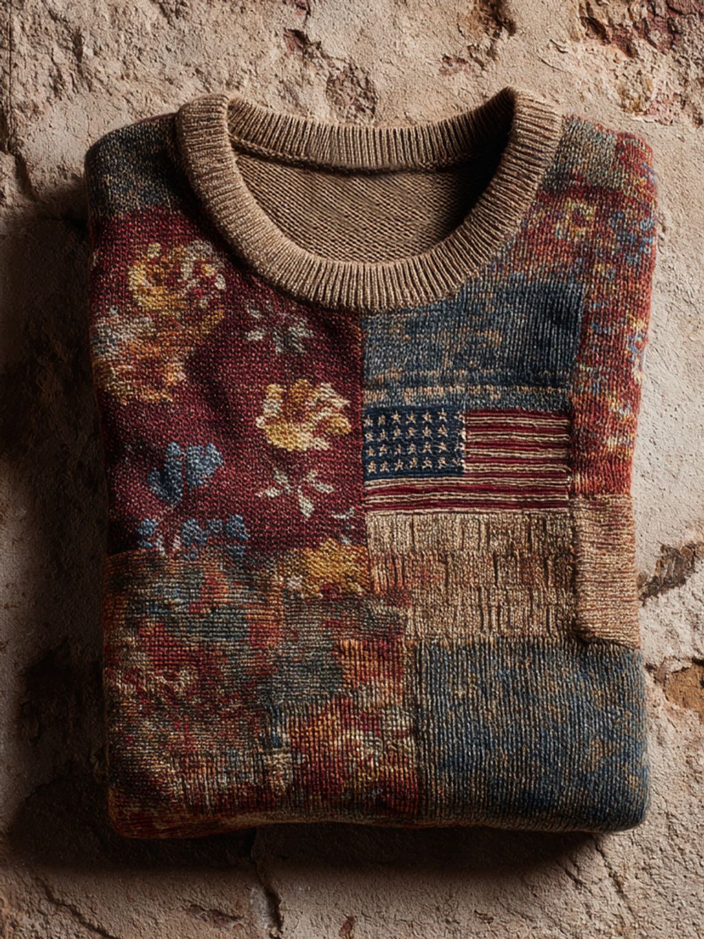Faith Vintage American Flag Patchwork Art Print Casual Knit Sweater