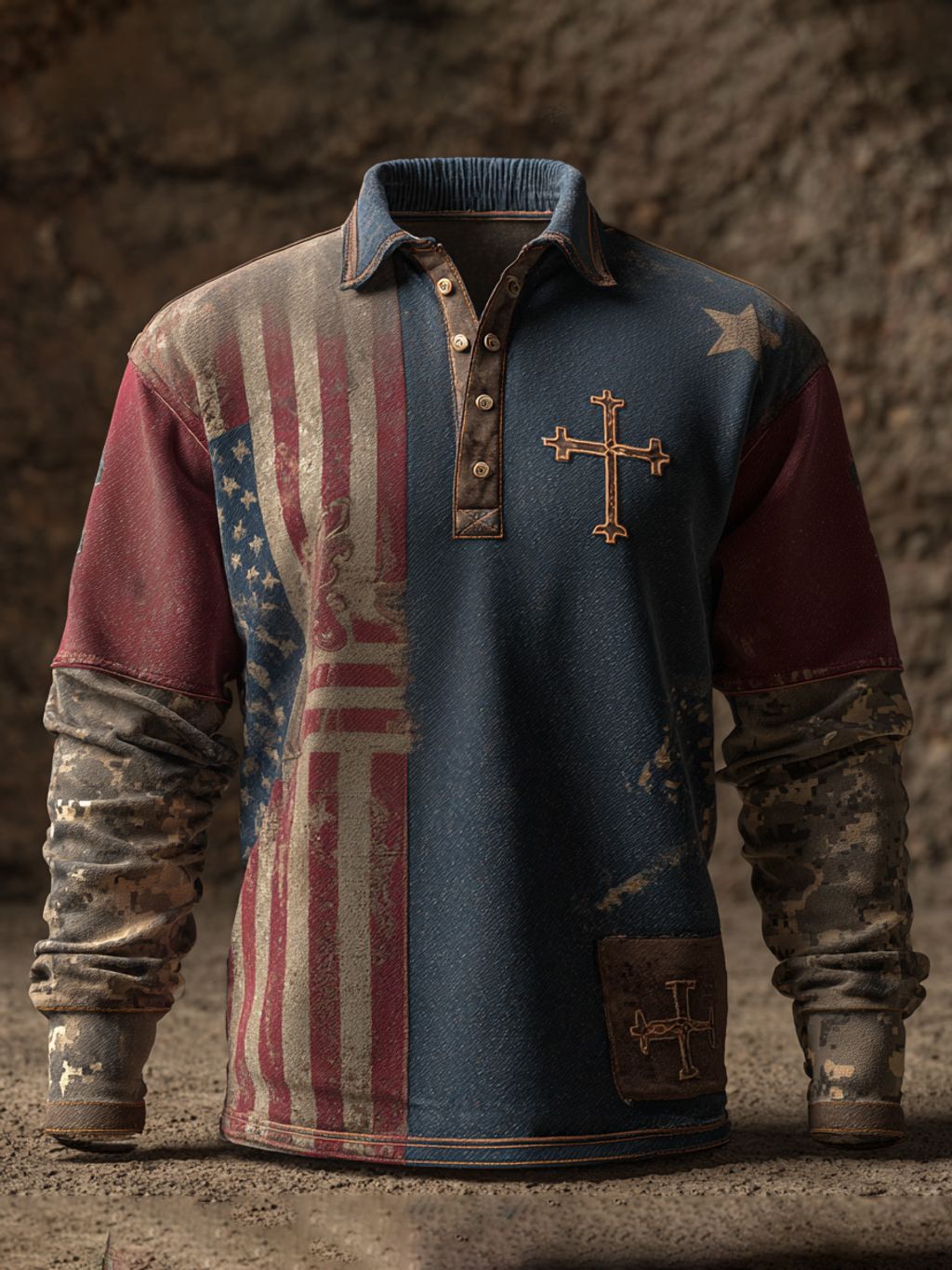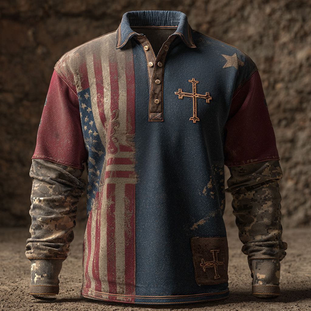 Faith Vintage American Flag Patchwork Print Long Sleeve Polo Shirt