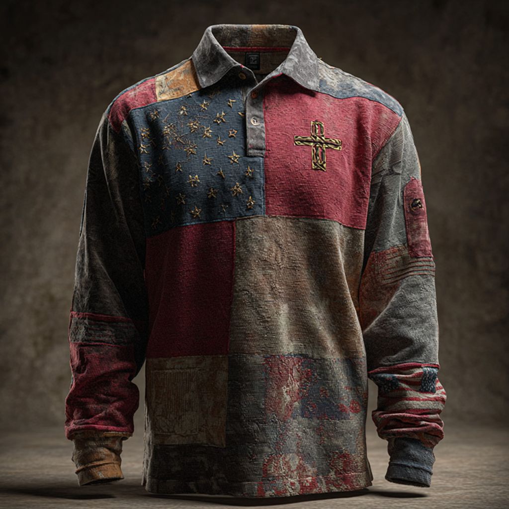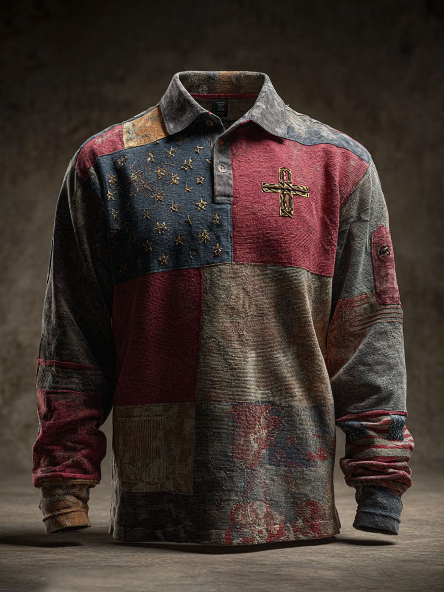 Faith Vintage American Flag Patchwork Print Long Sleeve Polo Shirt