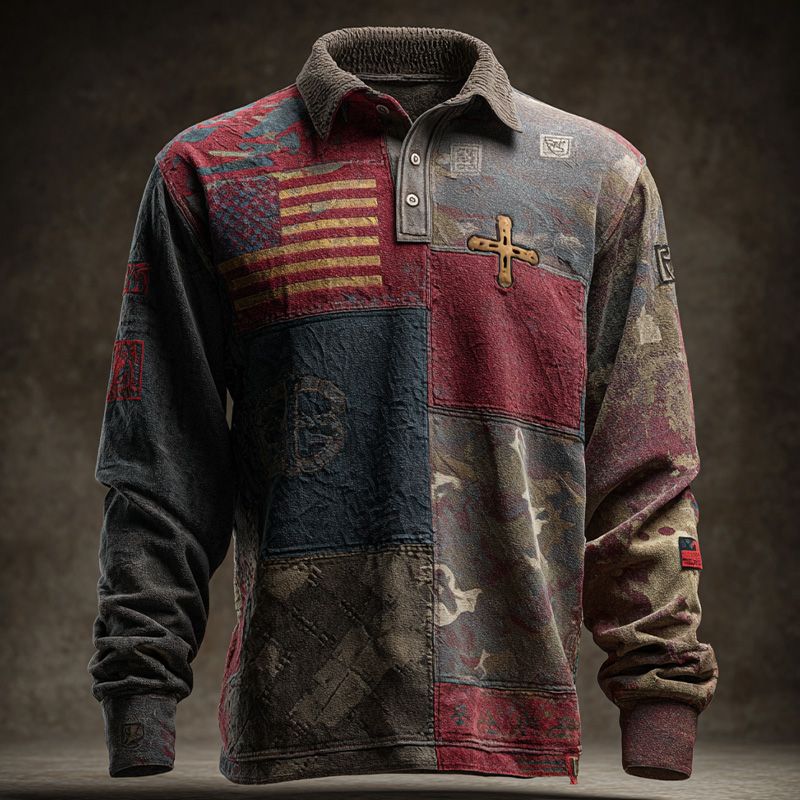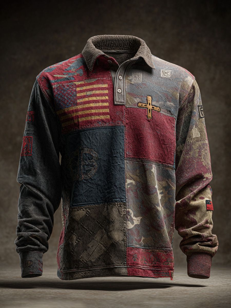 Faith Vintage American Flag Patchwork Print Long Sleeve Polo Shirt