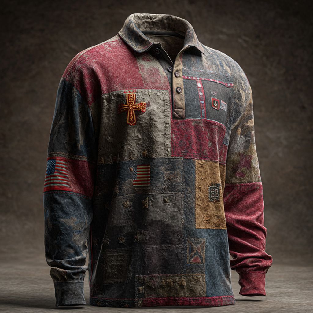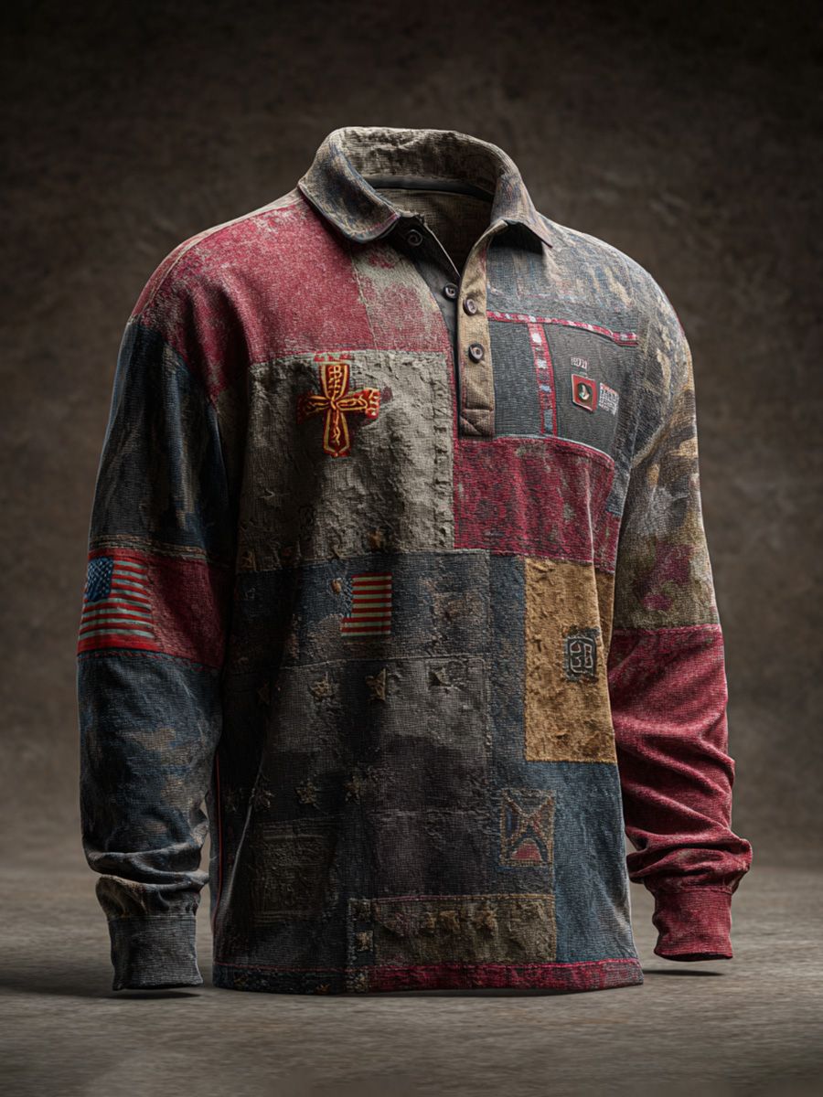 Faith Vintage American Flag Patchwork Print Long Sleeve Polo Shirt