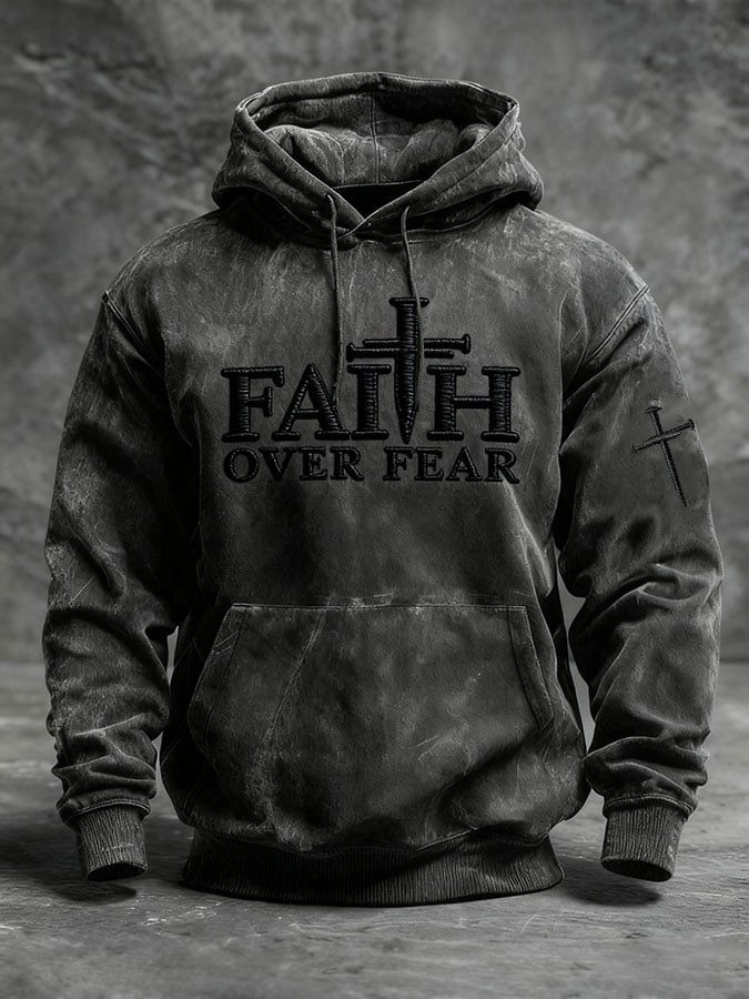 Men's Casual FAITH OVER FEAR Cross Printed Long Sleeve Hooded Sweatshirt