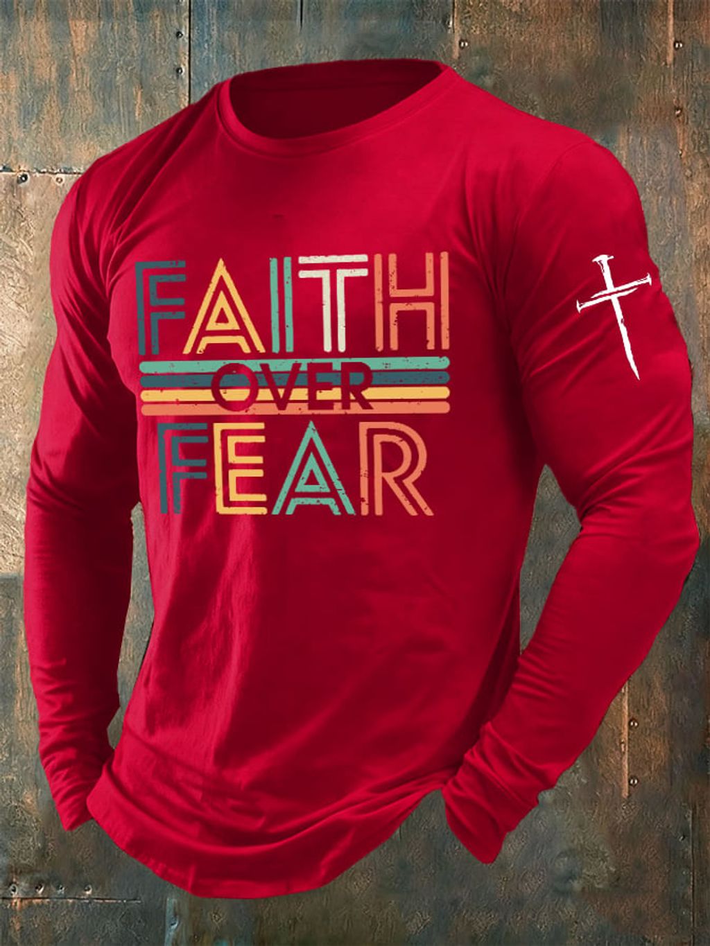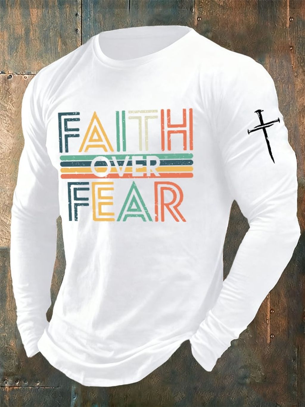 Men's casual long-sleeved faith overcomes fear printed long-sleeved T-shirt