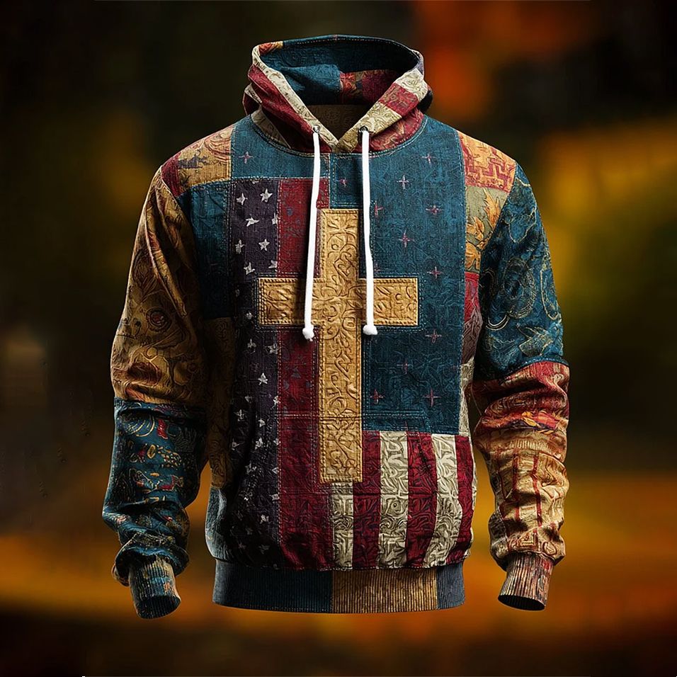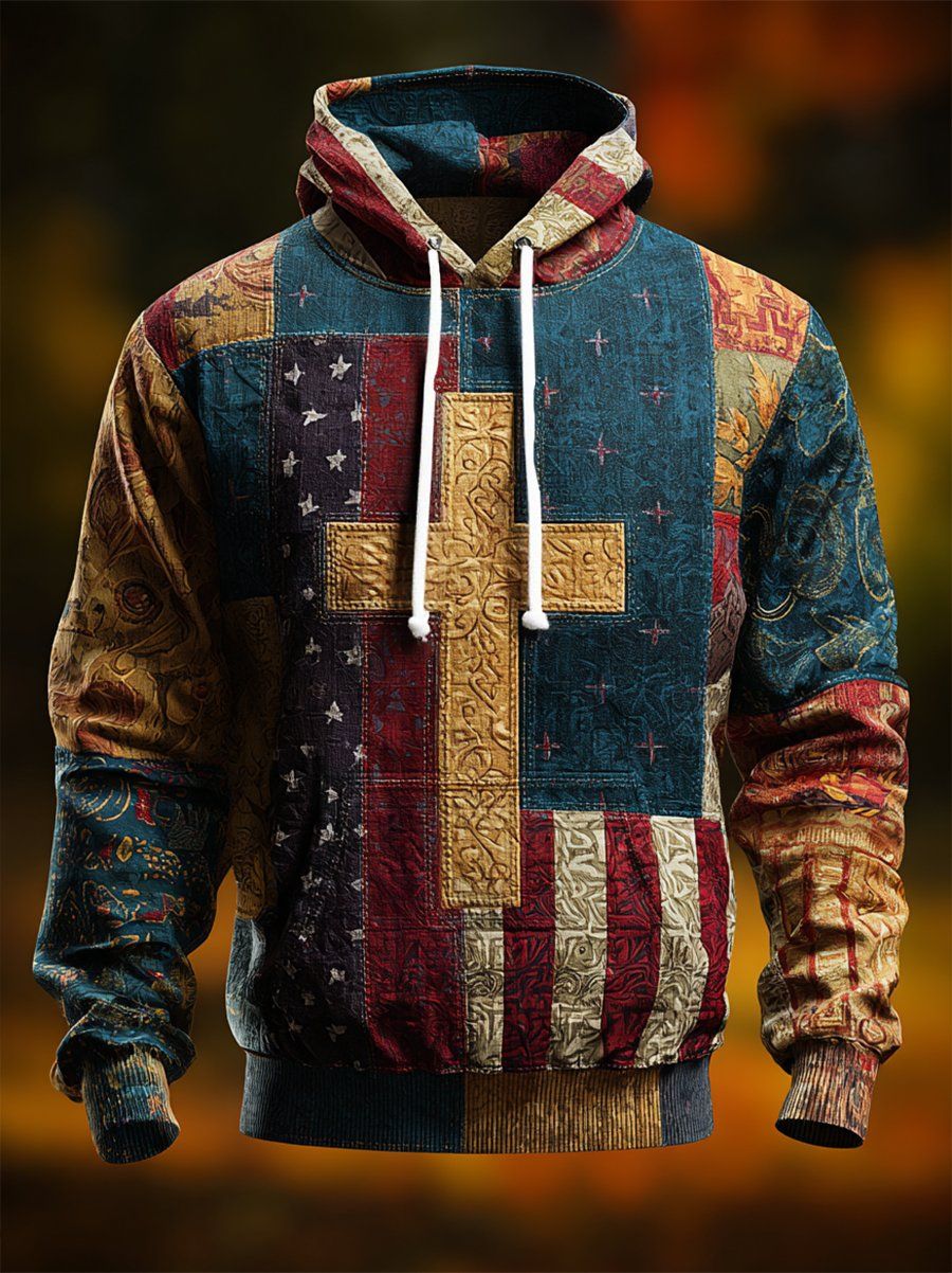 Men's Vintage Casual American Flag Cross Faith Hoodie