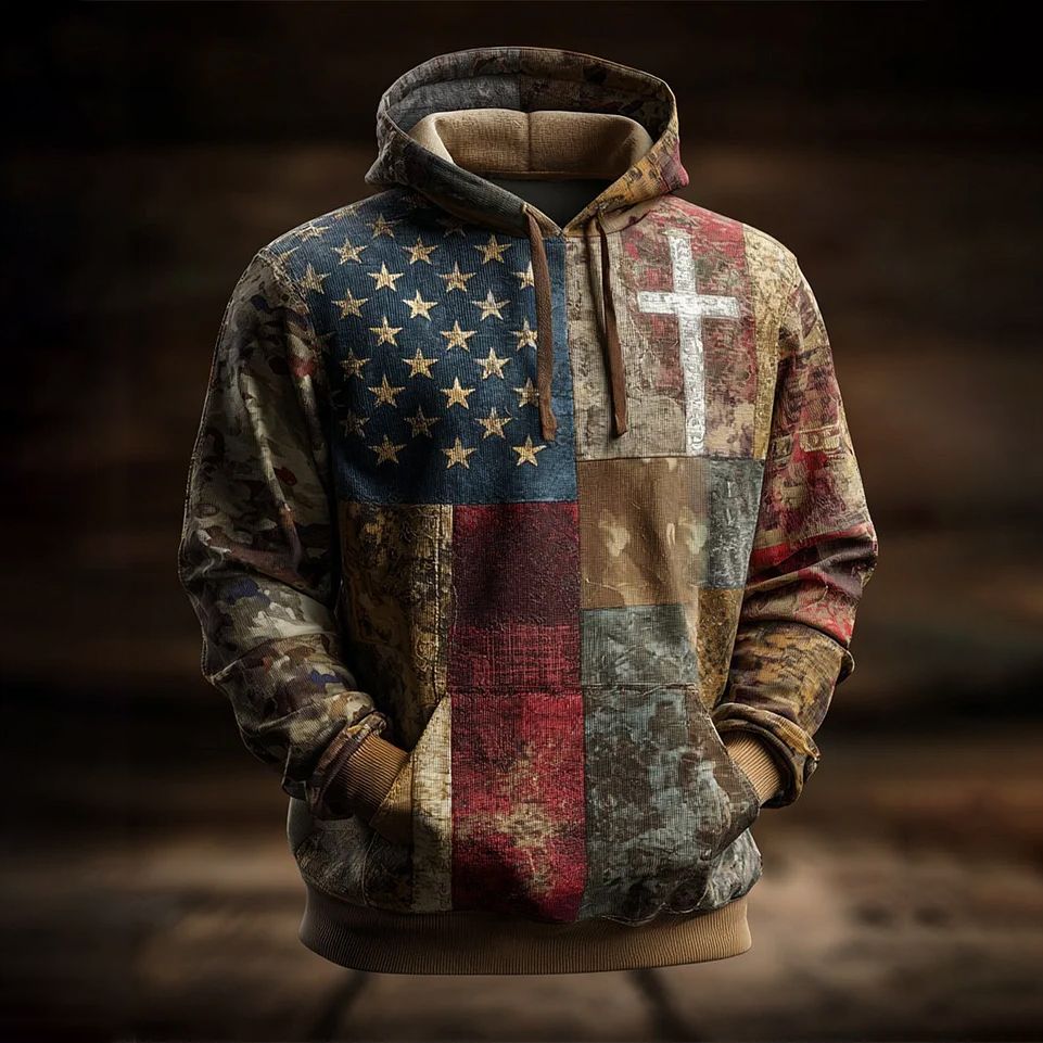 Men's Vintage Casual American Flag Cross Faith Hoodie
