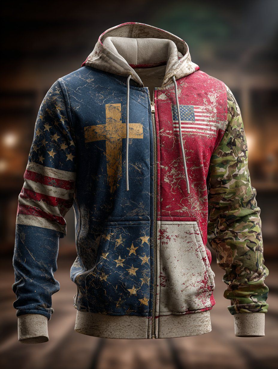 Men's Vintage Casual Faith American Flag Zip Hoodie