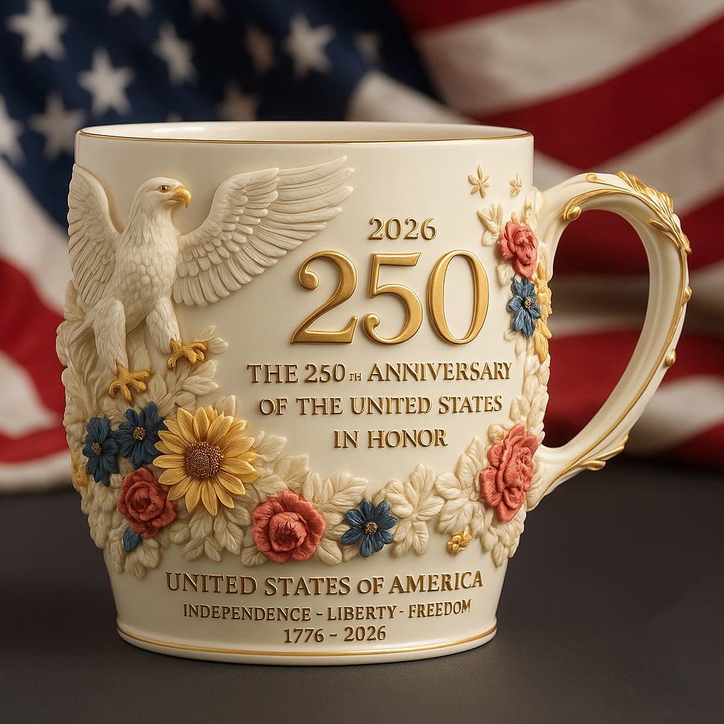 🦅 Honor America’s Legacy – Mark the historic 250th Anniversary of the United States with this stunning ceramic mug. Featuring a majestic bald eagle, golden “250” emblem, and embossed flowers in red, white, and blue, it’s a symbol of independence, liberty, and freedom.