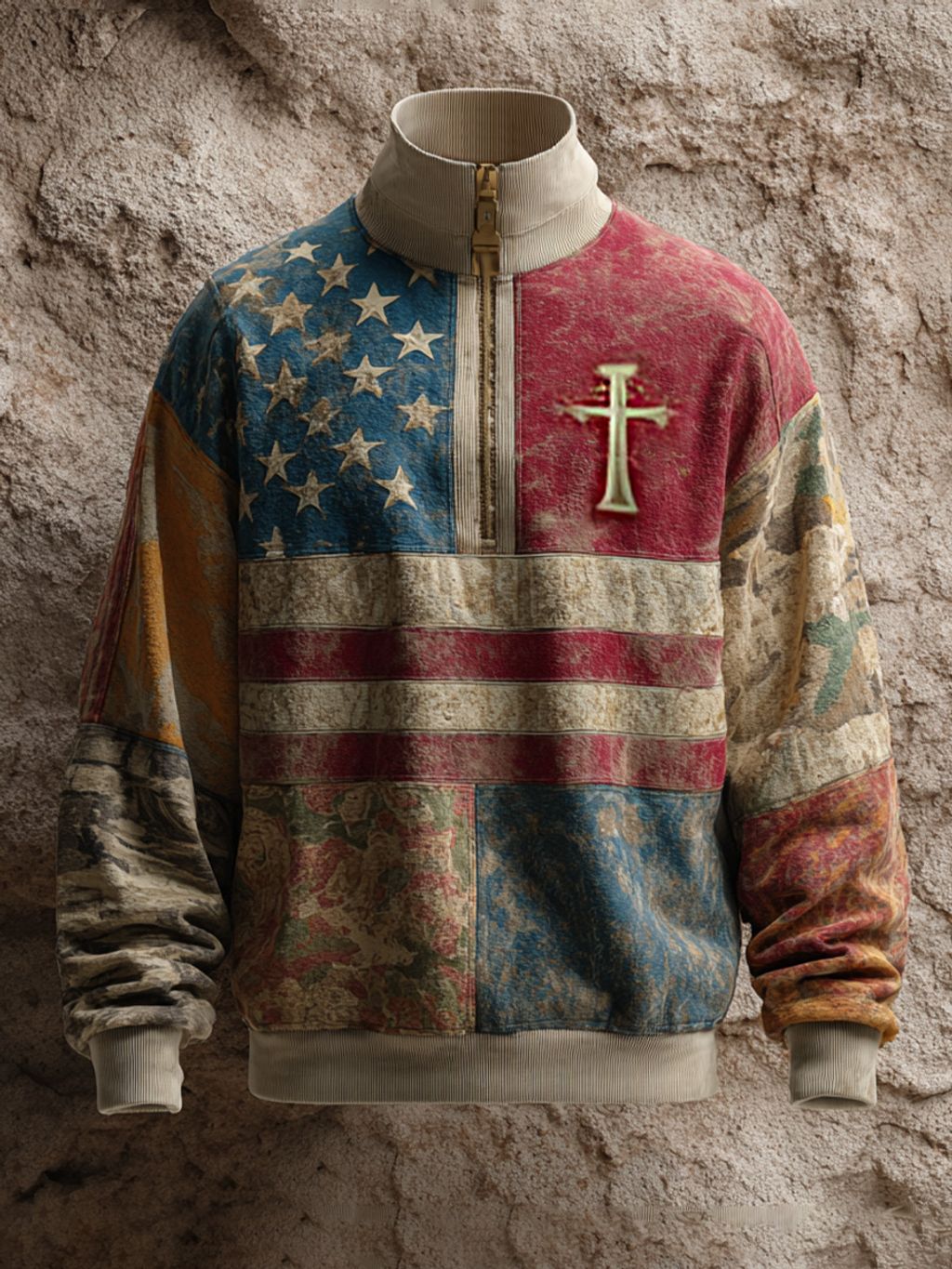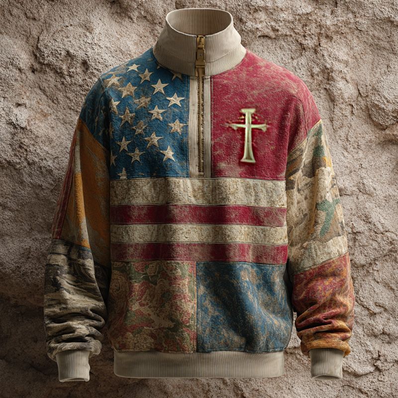Vintage American Flag Faith Art Print Casual Zip-Up Sweatshirt