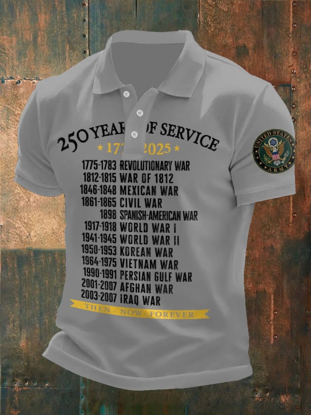 Vintage Men's United States Army 250 Years Of Service 1775-2025 Then - Now - Forever Printed Polo Shirt