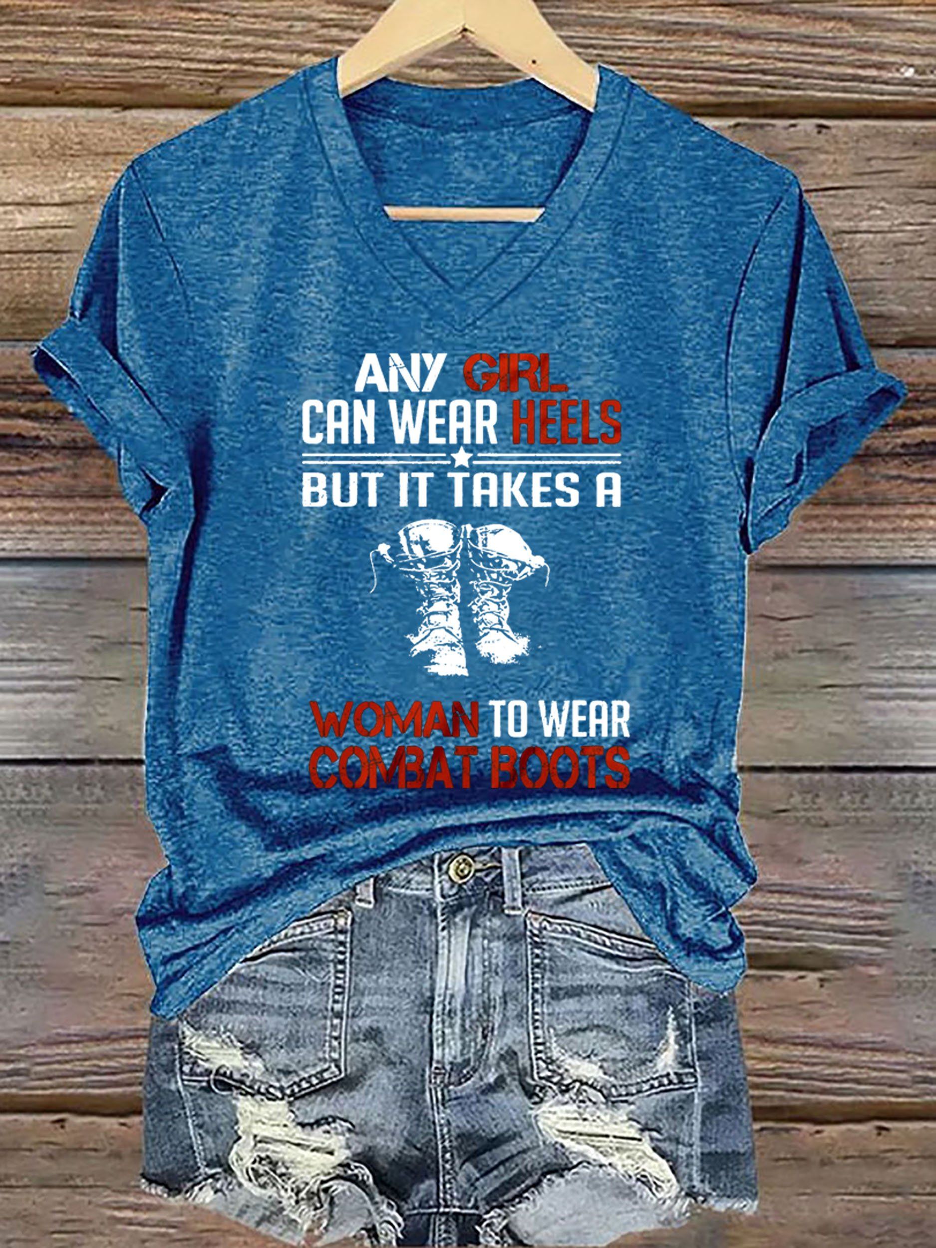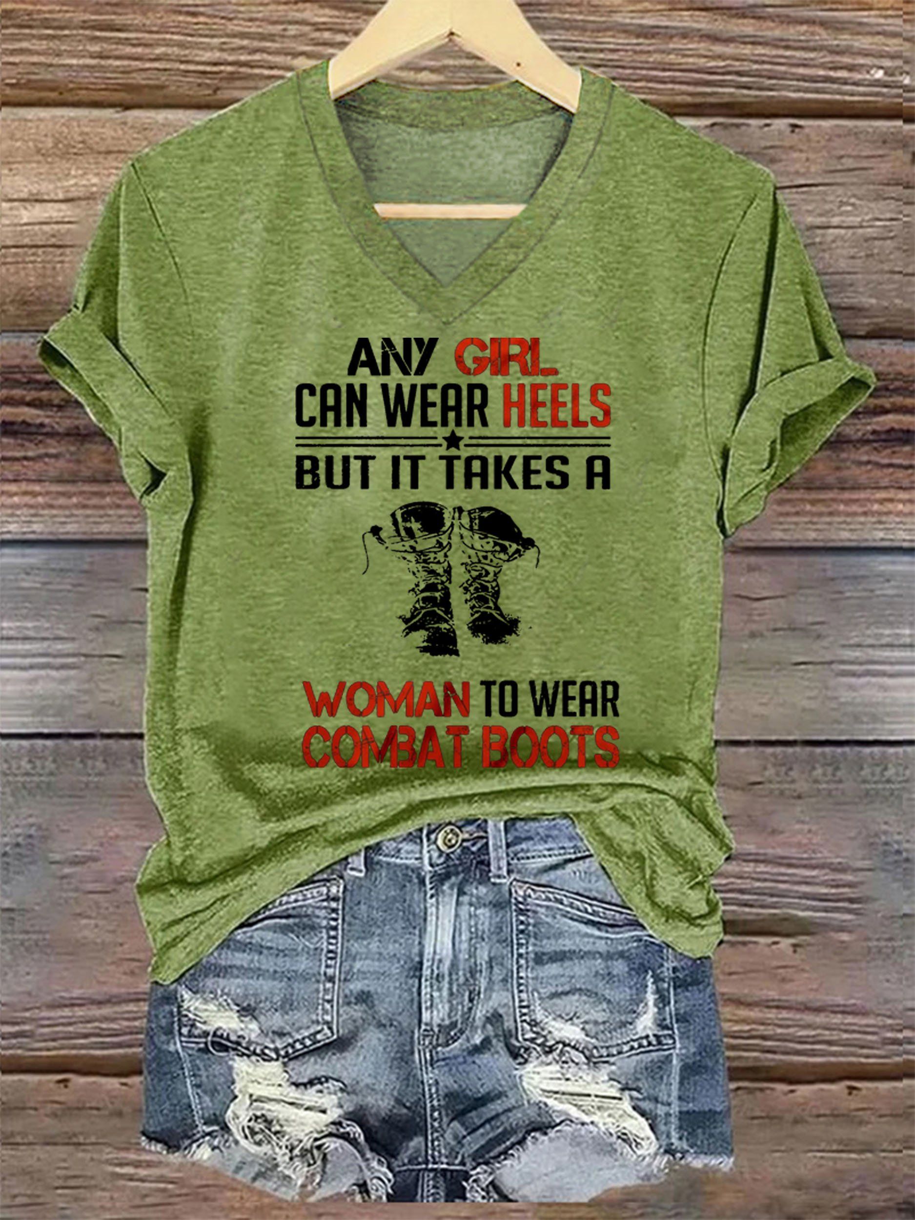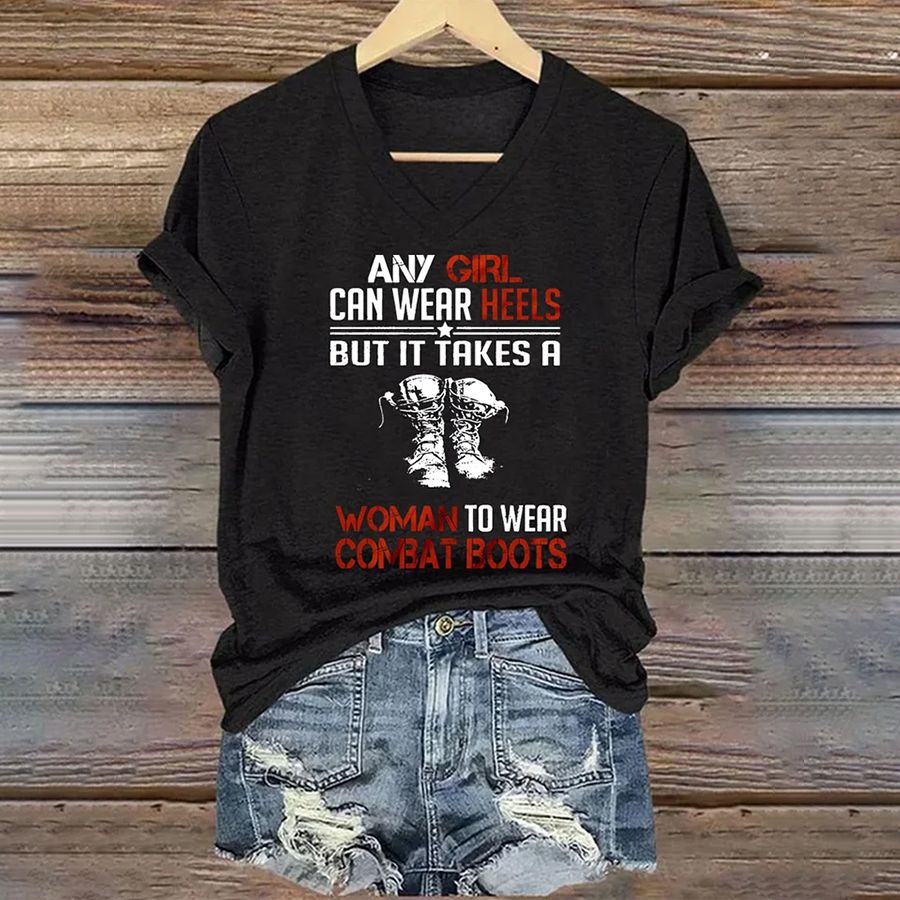 Women's Any Girl Can Wear Heels But It Takes A Woman To Wear Combat Boots Printed Short-Sleeved T-Shirt
