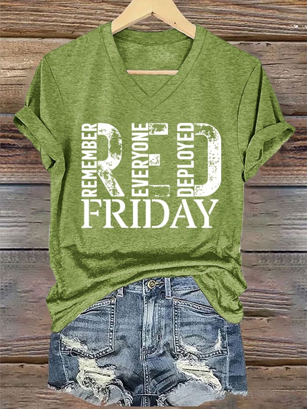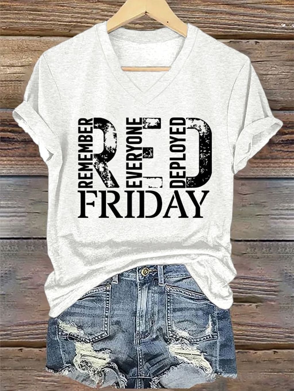 Women's On Fridays We Wear RED Remember Everyone Deployed Print V Neck T-shirt