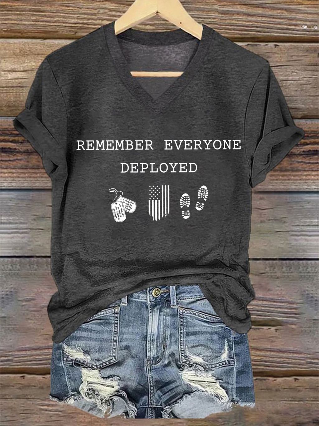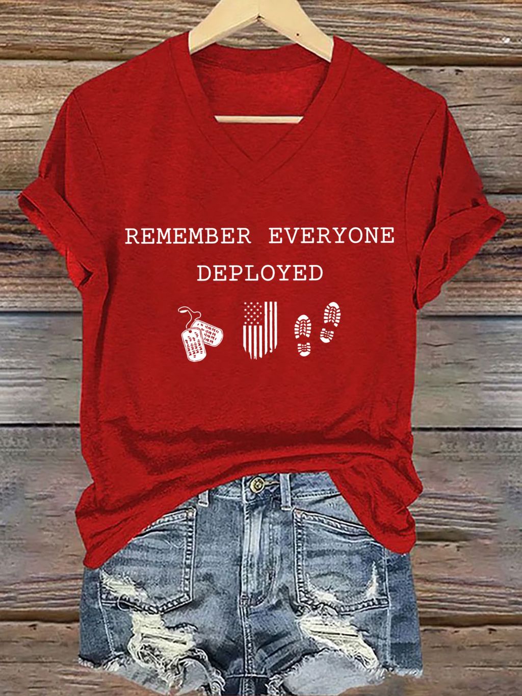 Women's On Fridays We Wear RED Remember Everyone Deployed Print V Neck T-shirt