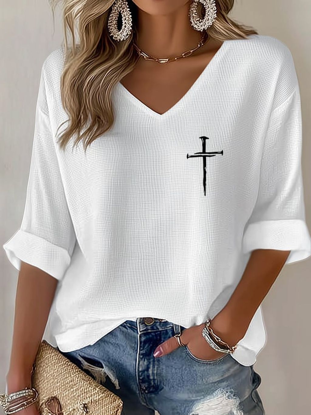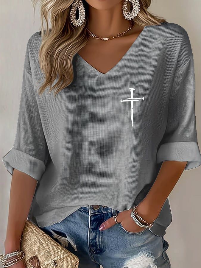 Women's Retro Faith Cross Design Printed Waffle Long Sleeve T-Shirt