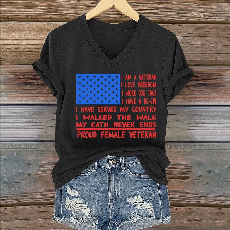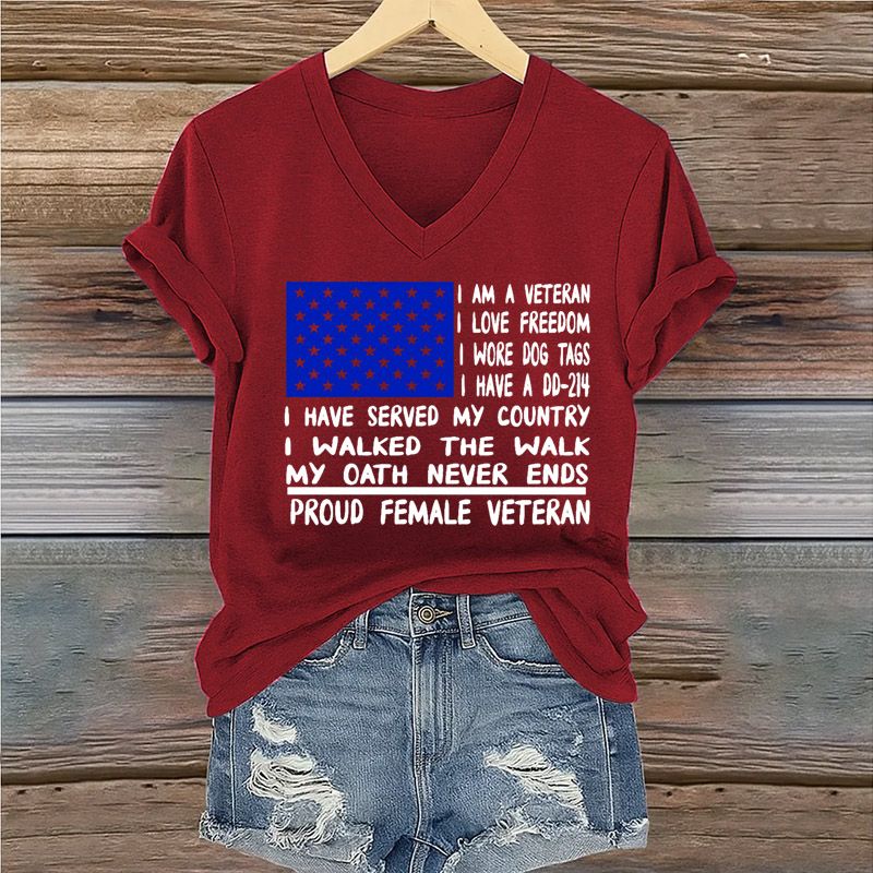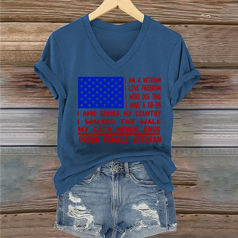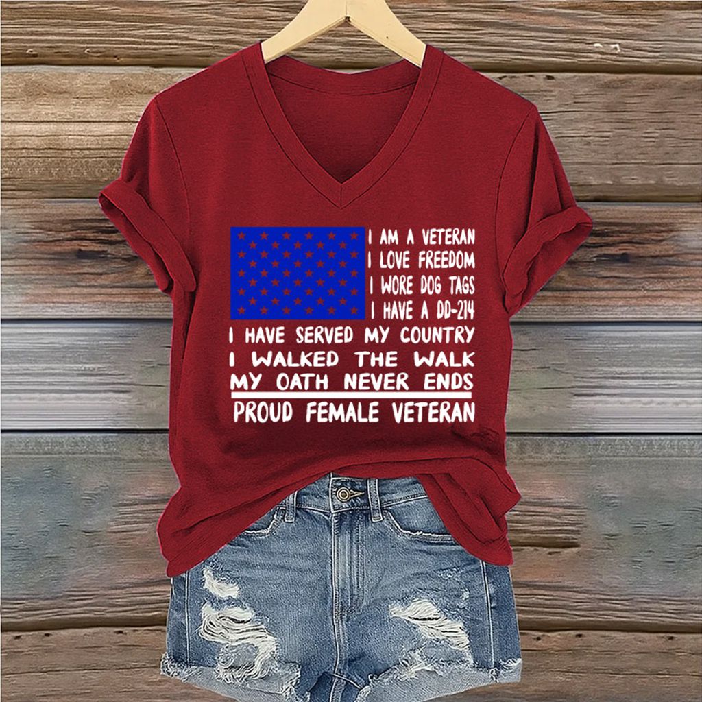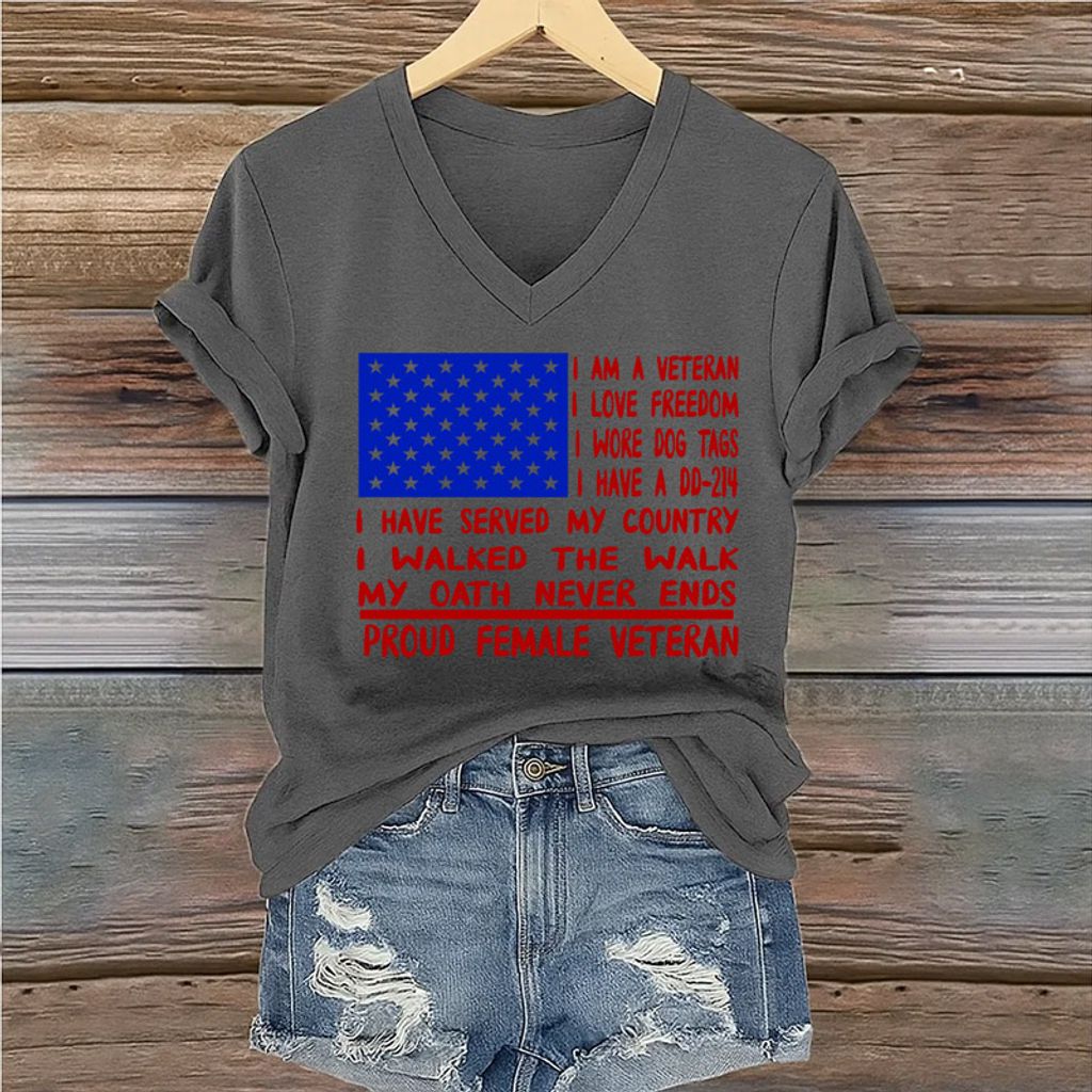 Women's Veteran Print Casual V-Neck Short Sleeve T-Shirt